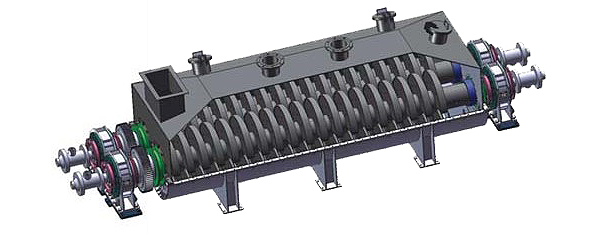 The hollow shaft is densely arranged with wedge shaped hollow pulp leaves, and the heat medium flows through the hollow shaft through the pulp leaves. In the unit effective volume, the heat transfer area is large, and the thermal medium temperature from -40 DEG C to 320 DEG C can be water vapor or liquid type, such as hot water, heat conducting oil, etc.. Indirect conduction heating does not carry air to take away heat, and heat is used to heat the material. The heat loss is only the heat dissipation to the environment through the insulation layer of the apparatus. The wedge heat transfer surface has self-cleaning function. The relative movement between the material particles and the wedge surface creates a scrubbing action to remove the material attached to the wedge surface so as to maintain a clean heat transfer surface during operation. The shell of the paddle dryer is Omega type, and two to four hollow mixing shafts are arranged in the shell. The shell is provided with a sealed end cover and an upper cover to prevent the leakage of material dust and give full play to the function.