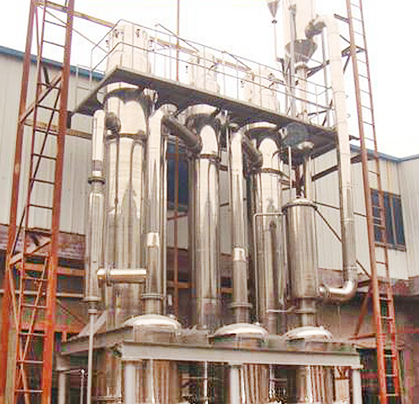 產(chǎn)品介紹:物料進(jìn)入降膜蒸發(fā)器頂部的布液器,使物料均勻分布于各管并沿各管內(nèi)壁呈膜狀均勻下降流動,管外加熱蒸汽對管內(nèi)液膜加熱并使之蒸發(fā),管下端流出的汽液混合物在分離器中進(jìn)行汽液分離,從而料液得到濃縮。